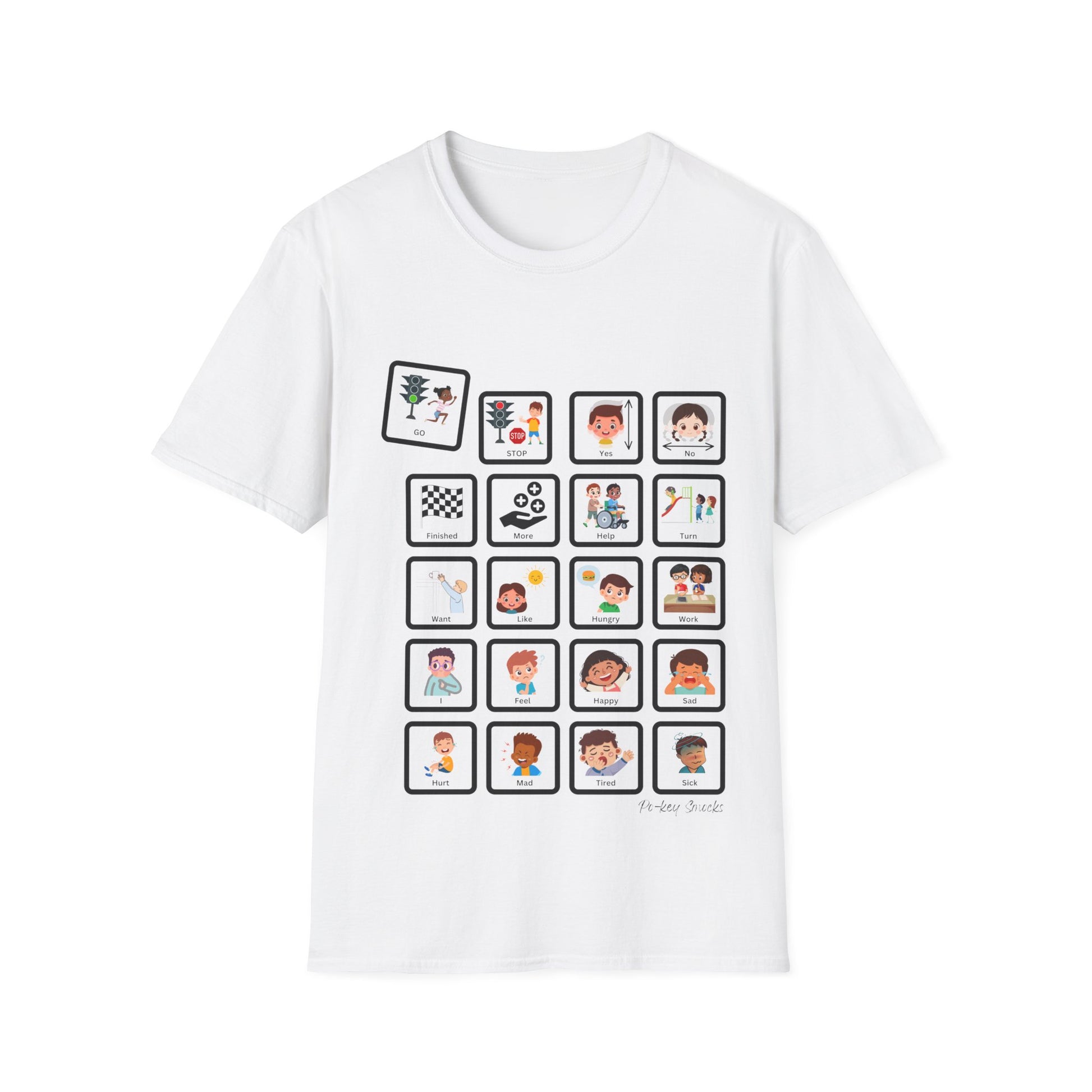 Assistive visual schedule communication board smock for basic care and communication at home. This unisex T-shirt allows participants to articulate requests, frustrations, needs, and responses with simple options. Perfect for adults who need assistance with basic communication and care. Relevant for everyday wear, especially for individuals with special needs.