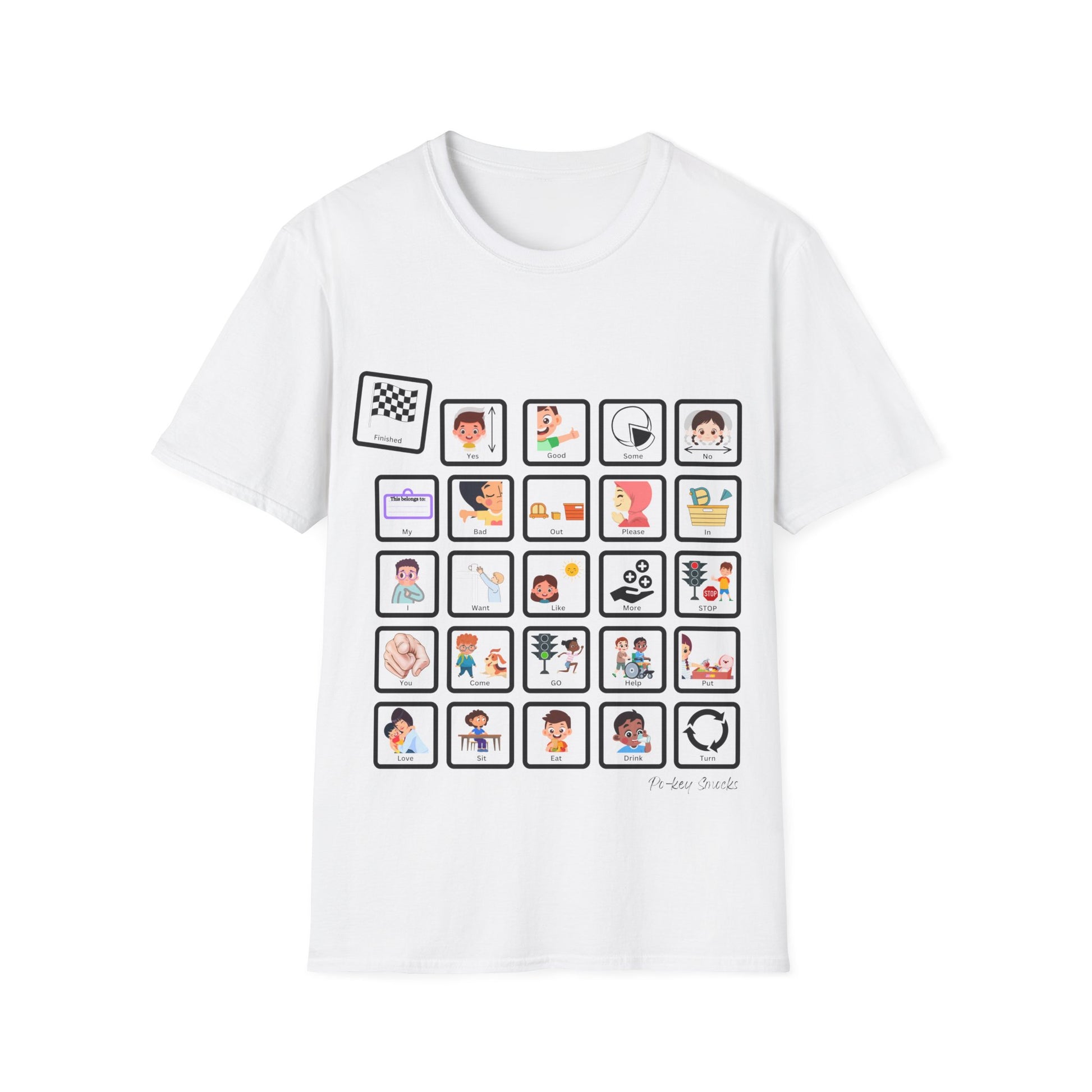 Assistive visual schedule communication board smock for intermediate general communication at home. With simple question, request, response and emotive options, the participant can articulate requests, frustrations, needs and responses to you. This Smock also allows for communicative expansion into multi-worded (multi-visual) communication (E.g. "I, want, (to) eat" and "I, love, you")