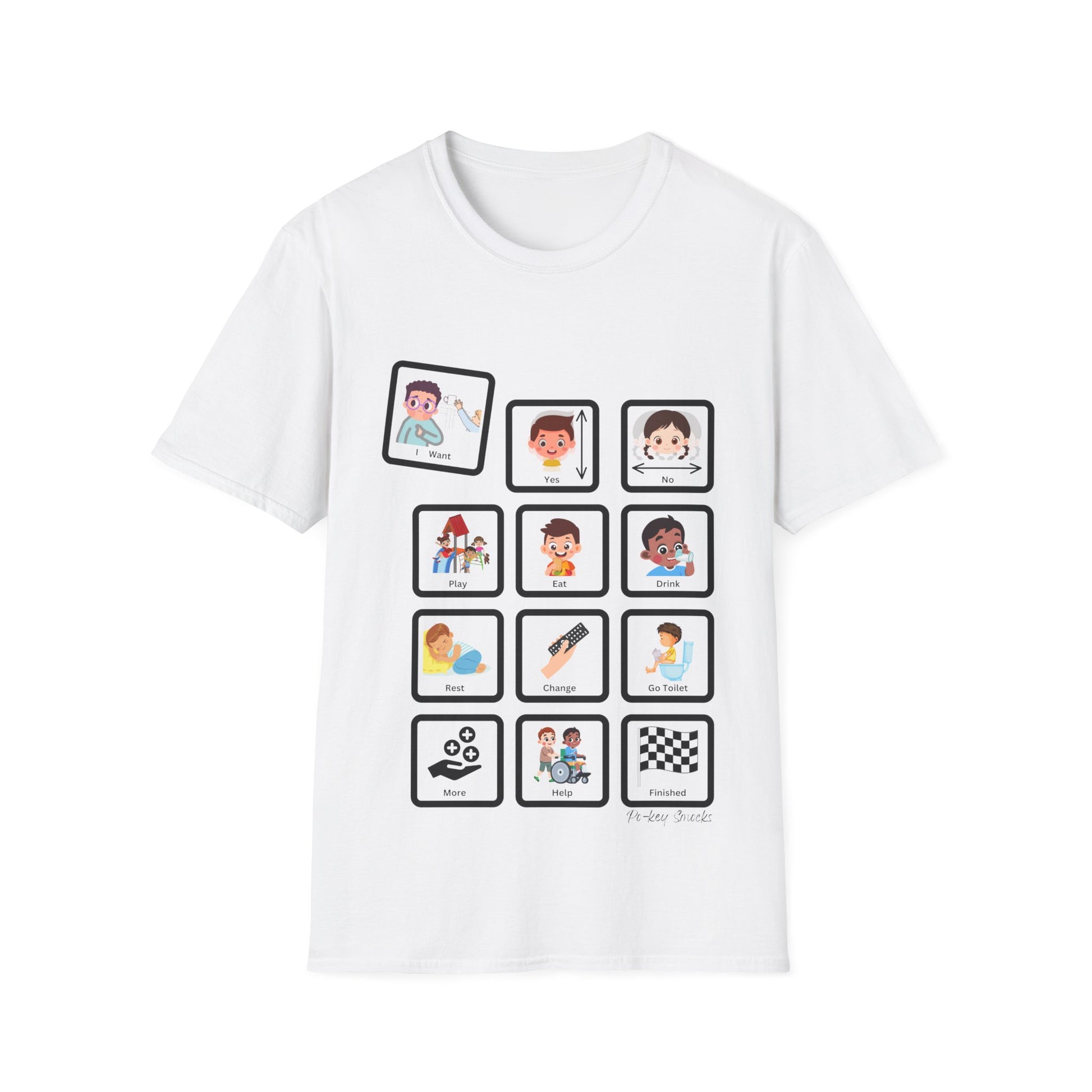 Assistive visual schedule communication board smock for basic care and communication at home. Utilising visuals support, with mainly single-word questions, requests and responses, the participant can articulate requests, needs and responses to you and be informed of requests or reminders you have of them. It also allows for the introduction of a two-step communication phase with "I want".